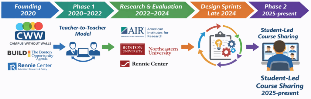 Campus Without Walls (CWW) is a groundbreaking, statewide ecosystem that reimagines public education by connecting schools, educators, and industry partners across Massachusetts. Through a live, virtual, credit-bearing course exchange paired with real-world, work-based learning, CWW enables students to access advanced coursework, industry-designed modules, and authentic employer engagement, regardless of a student’s zip code or school assignment.