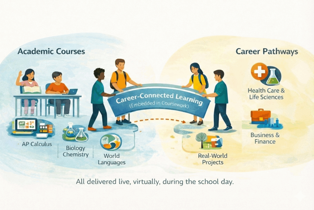 The Campus Without Walls model intentionally integrates career-connected learning directly into the academic experience, ensuring students gain meaningful exposure to careers while earning course credit during the school day. Rather than treating career exploration as a separate or extracurricular activity, CWW embeds it within live, virtual coursework—making it accessible to all students.